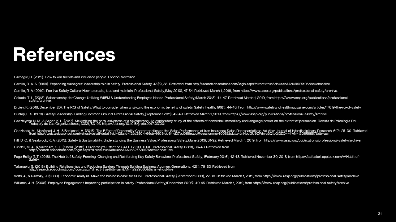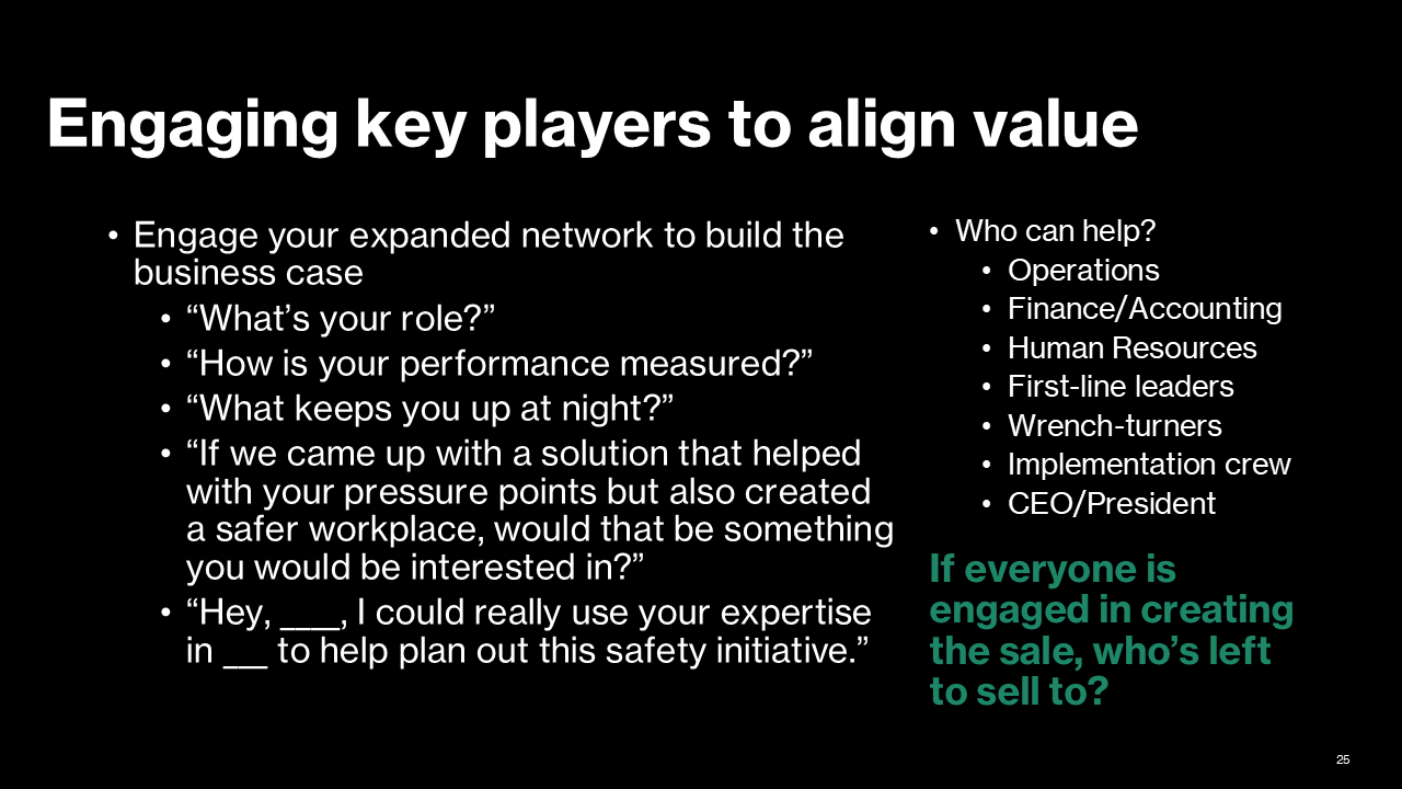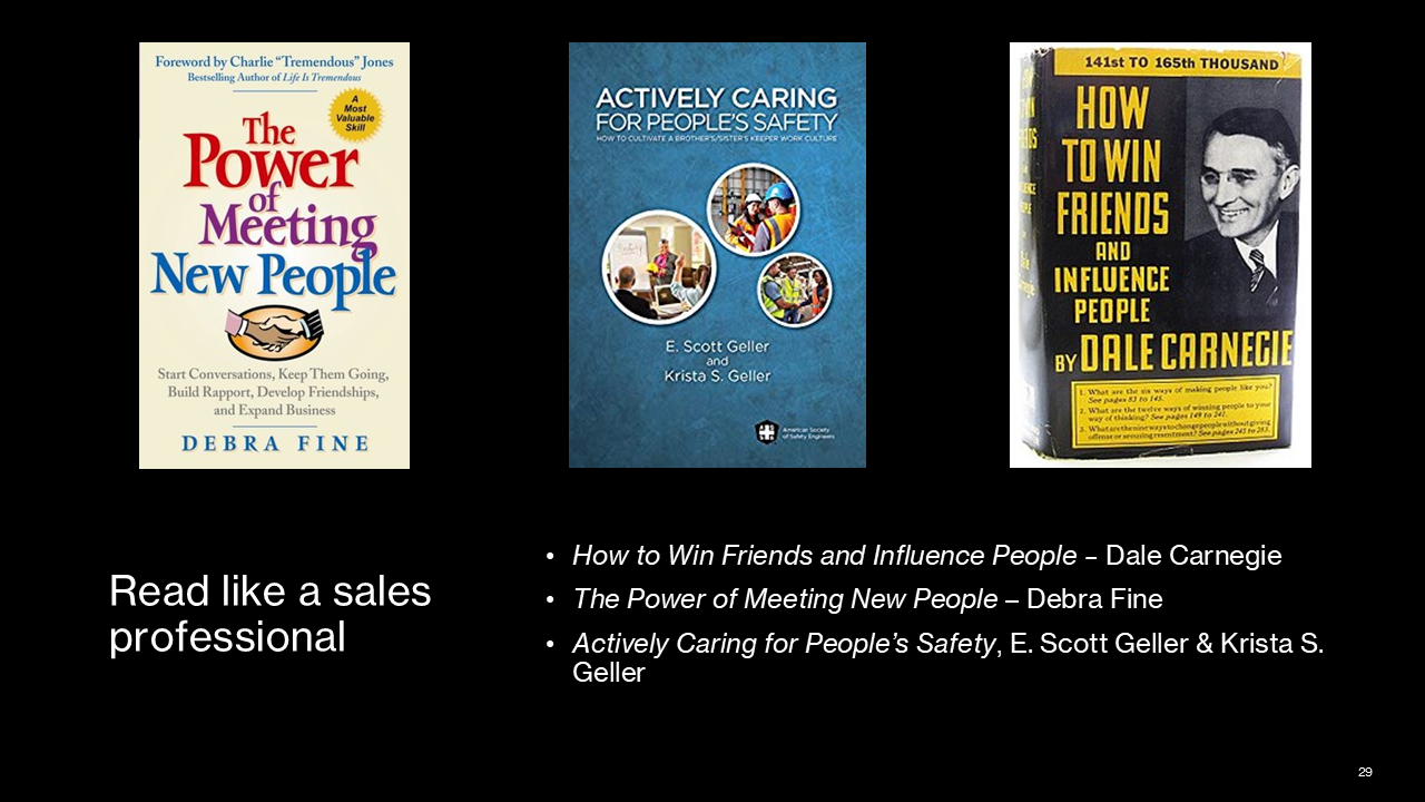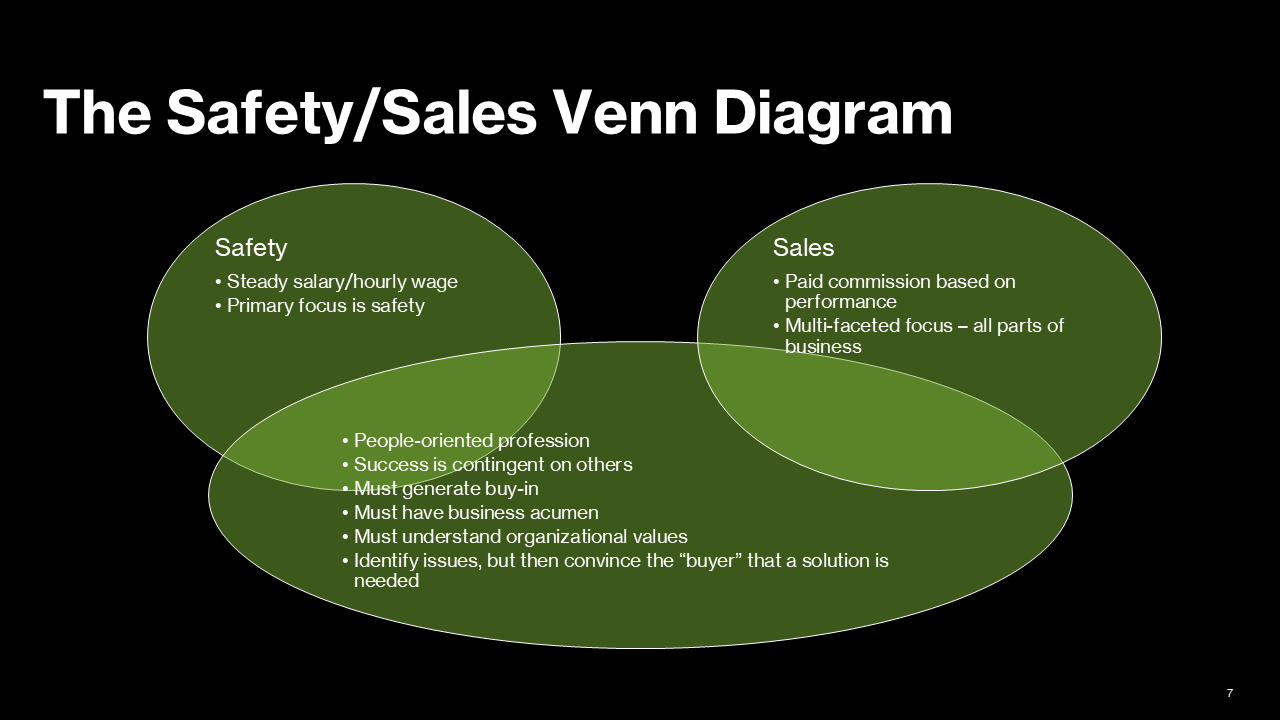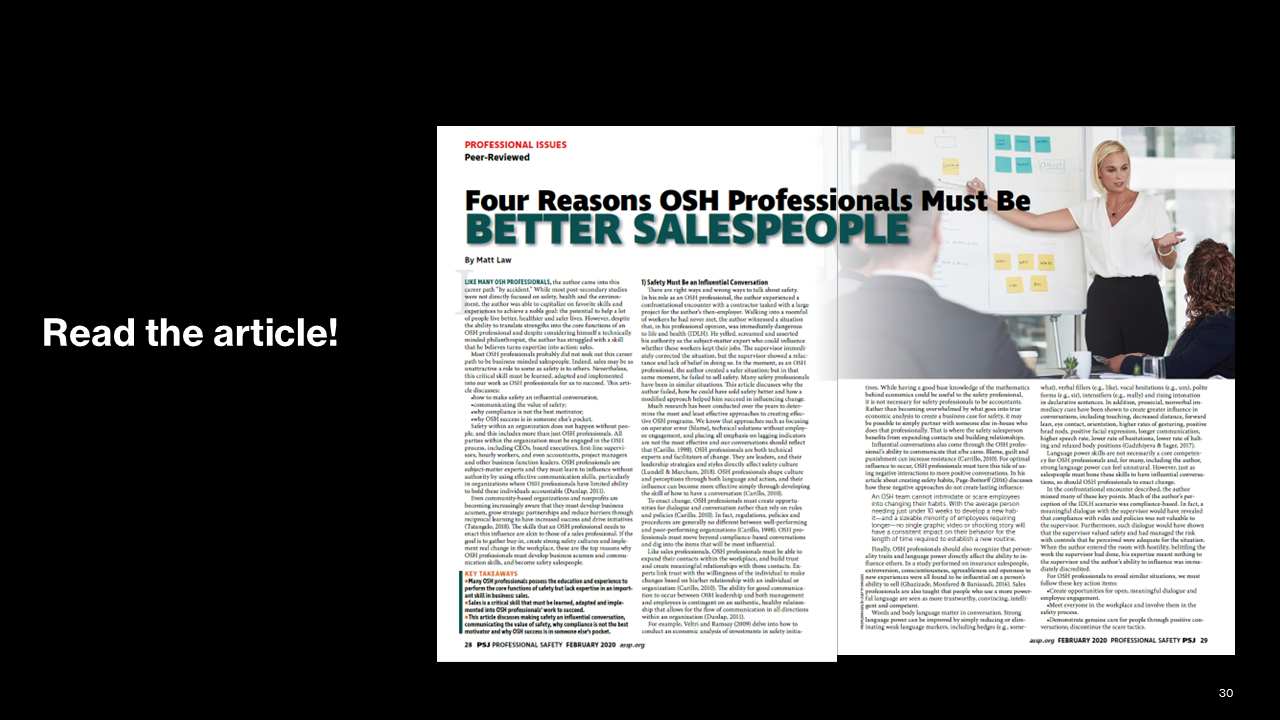 Most safety professionals did not pursue the safety profession to be salespeople. However, salespeople have superior influential skills that are critical to our role as safety professionals and our ability to protect people, property, and the environment. As safety professionals develop, much focus is placed on technical skills, the ability to interpret codes, standards, and best practices and implement them into system design and policy development. Safety, however, does not happen without the element of people, and the buy-in of all people within the organization can make or break the implementation of safety initiatives and the development of safety culture. Safety professionals must add to their core competencies the skills common among salespeople to have influential conversations, demonstrate safety's value, and align this value to the organization.