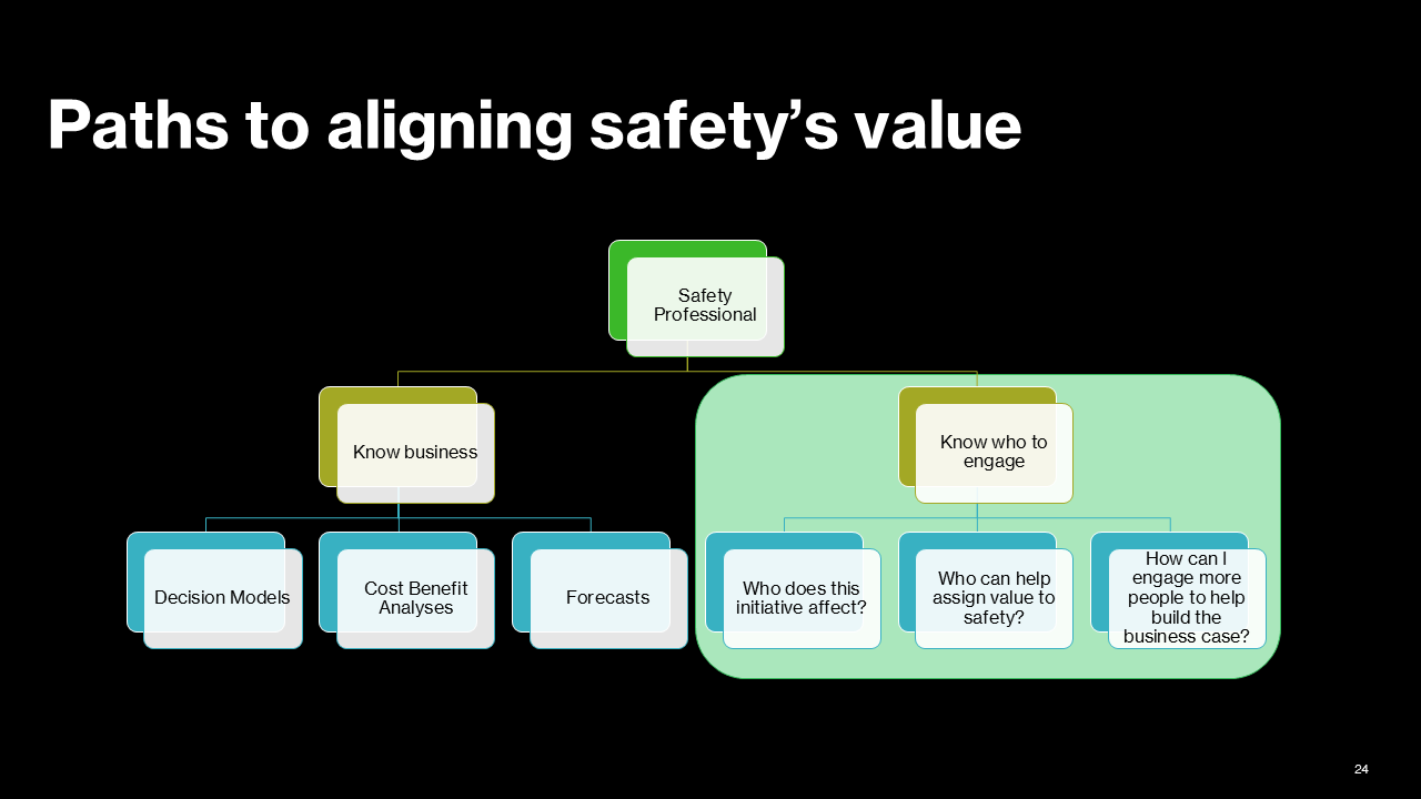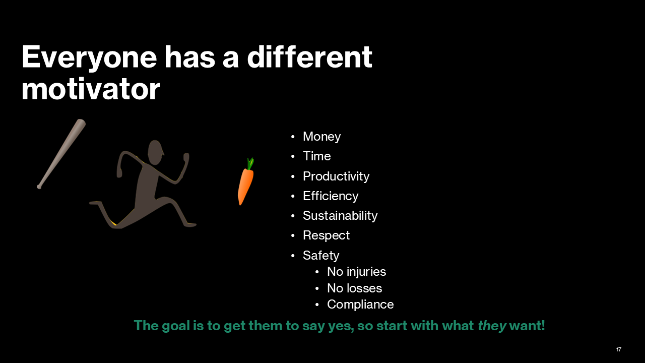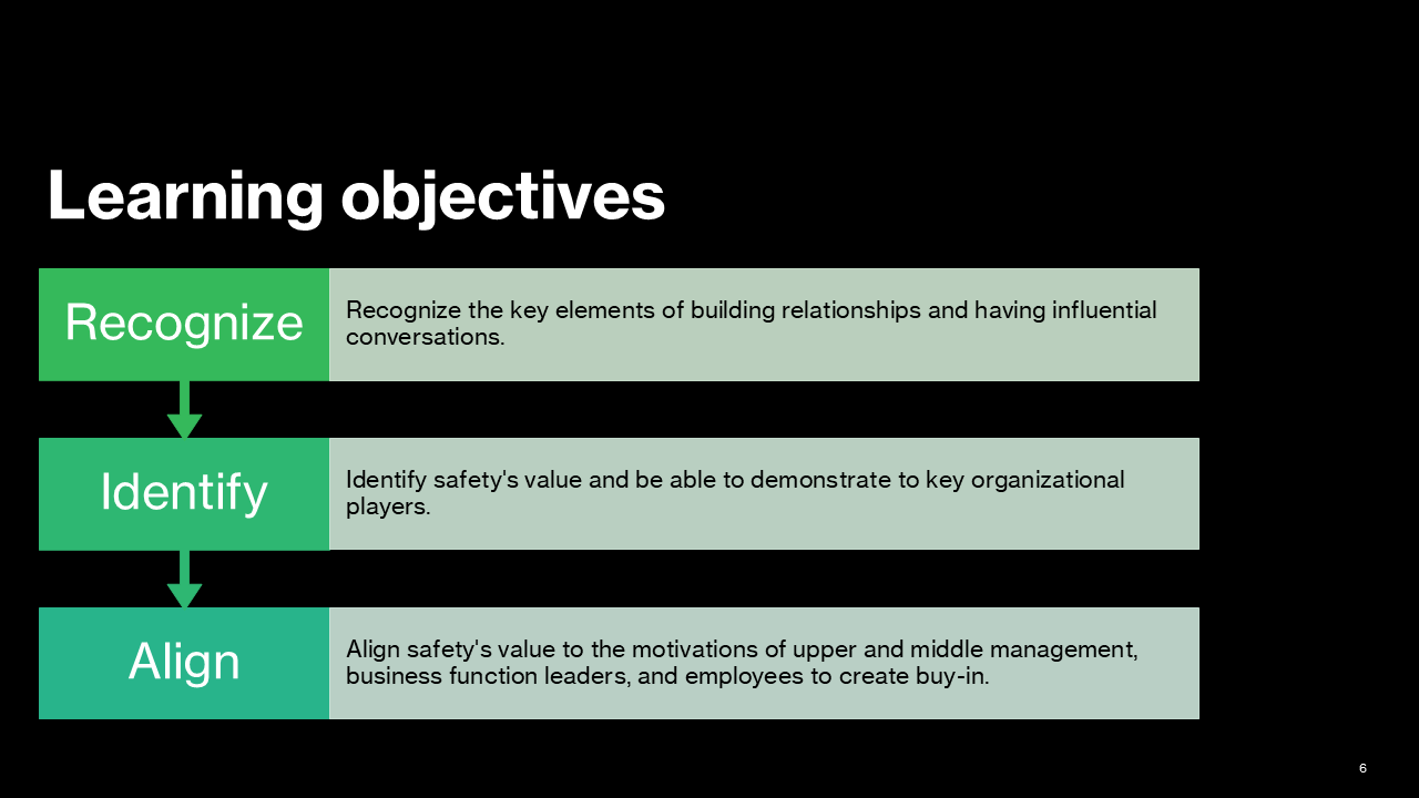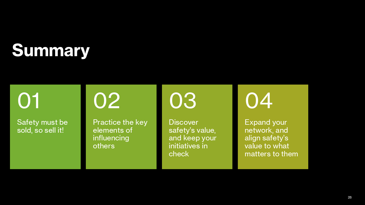 Most safety professionals did not pursue the safety profession to be salespeople. However, salespeople have superior influential skills that are critical to our role as safety professionals and our ability to protect people, property, and the environment. As safety professionals develop, much focus is placed on technical skills, the ability to interpret codes, standards, and best practices and implement them into system design and policy development. Safety, however, does not happen without the element of people, and the buy-in of all people within the organization can make or break the implementation of safety initiatives and the development of safety culture. Safety professionals must add to their core competencies the skills common among salespeople to have influential conversations, demonstrate safety's value, and align this value to the organization.