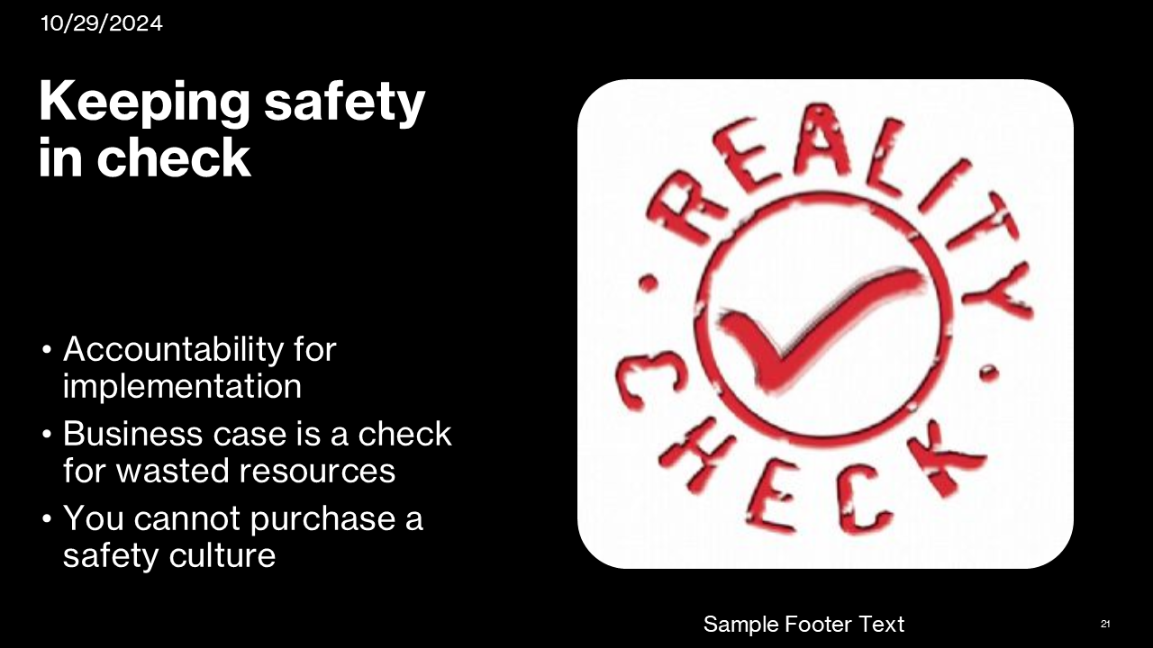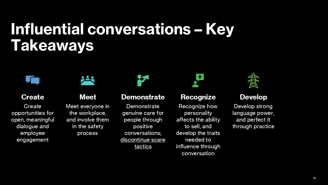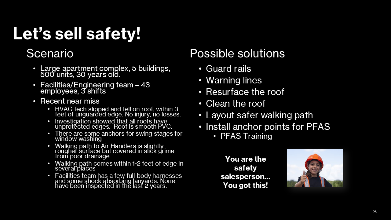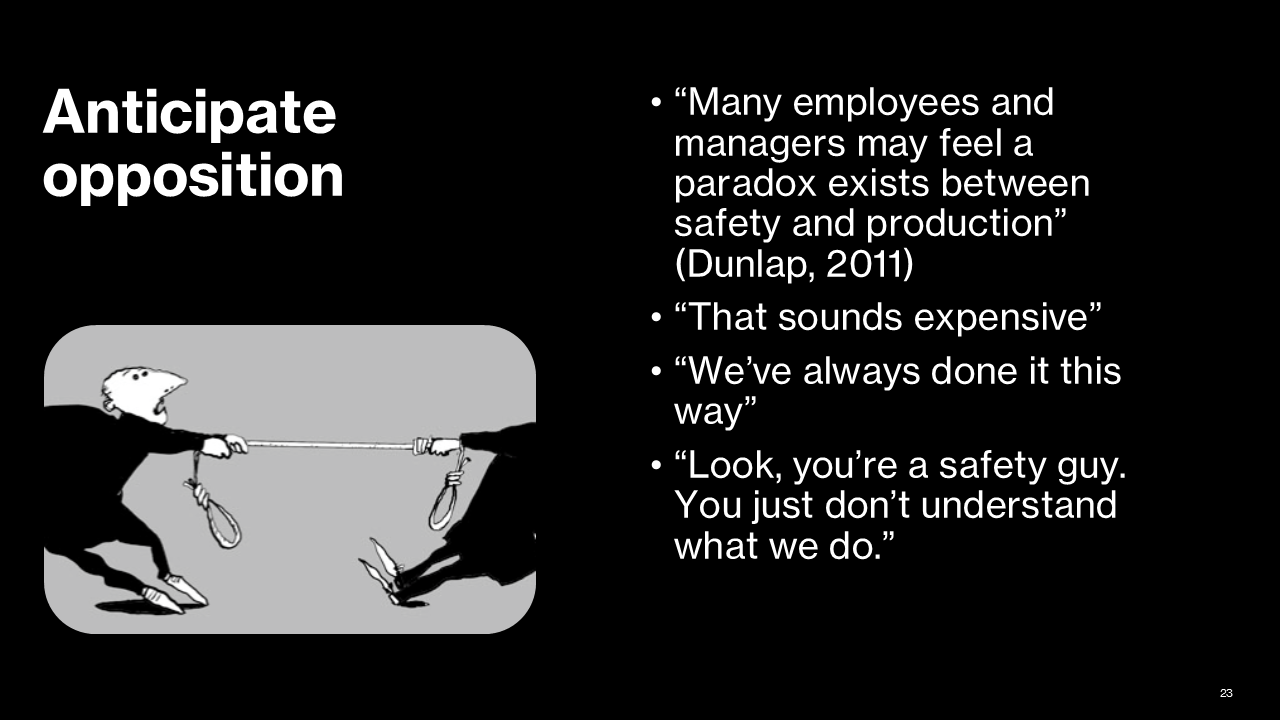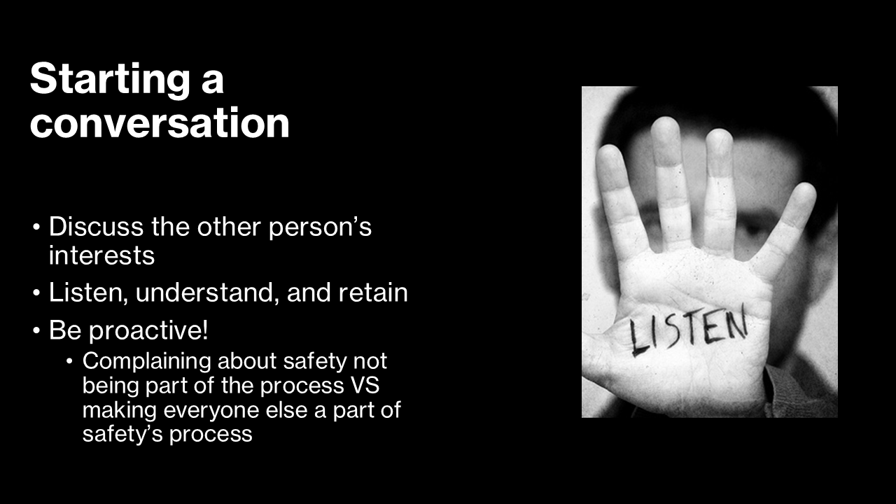 Most safety professionals did not pursue the safety profession to be salespeople. However, salespeople have superior influential skills that are critical to our role as safety professionals and our ability to protect people, property, and the environment. As safety professionals develop, much focus is placed on technical skills, the ability to interpret codes, standards, and best practices and implement them into system design and policy development. Safety, however, does not happen without the element of people, and the buy-in of all people within the organization can make or break the implementation of safety initiatives and the development of safety culture. Safety professionals must add to their core competencies the skills common among salespeople to have influential conversations, demonstrate safety's value, and align this value to the organization.